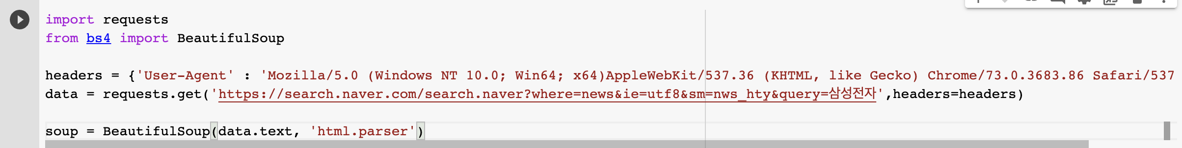 즉, 이렇게 이미 받아온 정보를 솎아서 원하는 정보만을 스크래핑 하는 것이 가능합니다. 크롤링 기본 코드는 아래와 같습니다. 복사해서 붙여넣어준 후, 뉴스 스크래핑을 시작해봅니다.