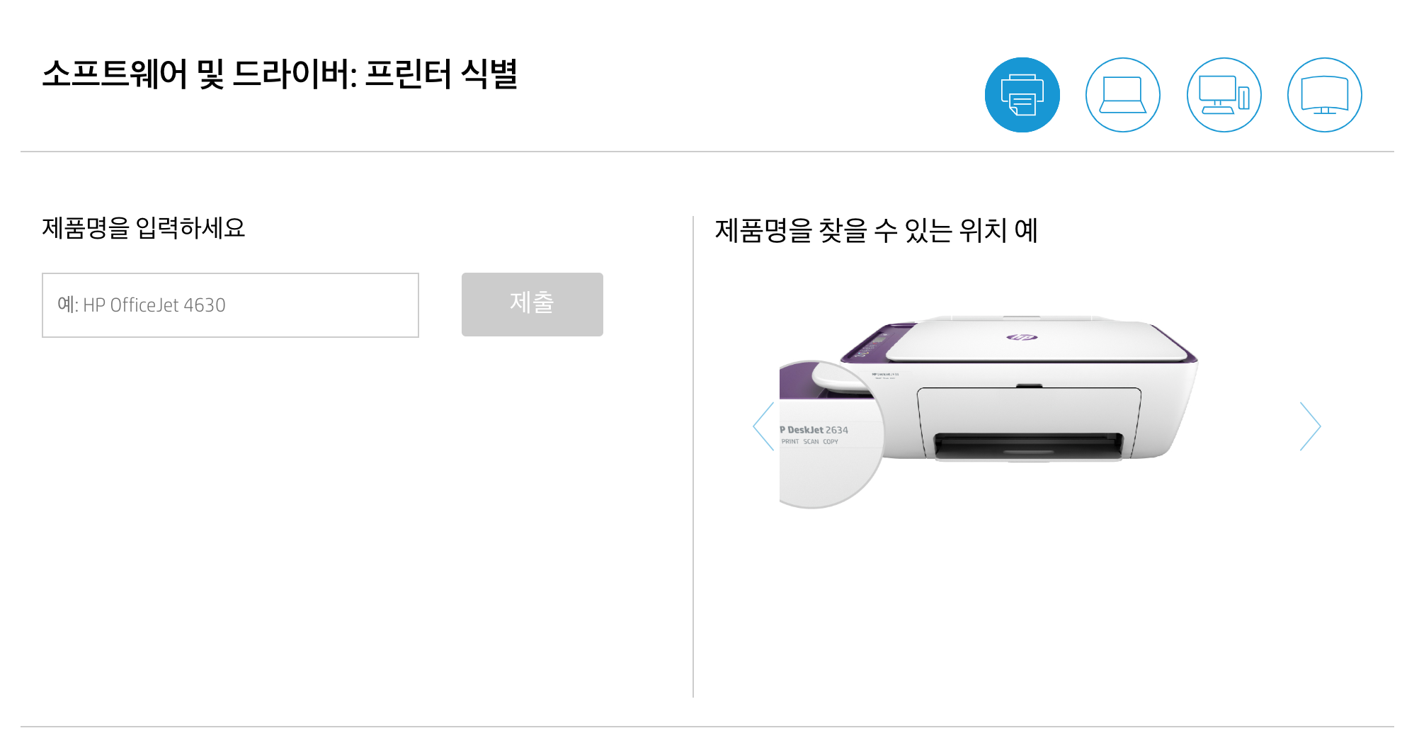 프린터 드라이버를 찾으신다면 [프린터]를 눌러주신 후, 위와 같은 화면이 나오면 제품명을 입력해주면 됩니다. 보유하고 있는 프린터의 제품명을 찾을 수 있는 위치의 예가 상세히 설명되어 있기 때문에 확인하신 후 제품명을 입력하시면 손쉽게 드라이버 파일을 다운로드 받으실 수 있습니다.