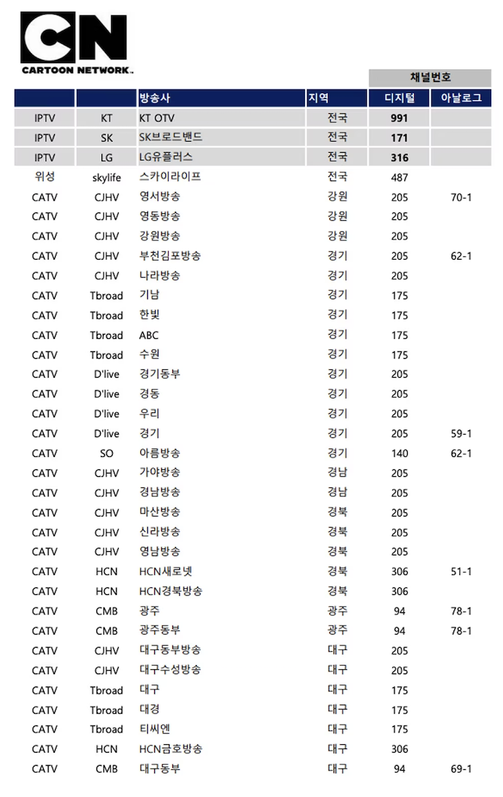 카툰 네트워크와 부메랑은 지역과 방송사에 따라 채널번호가 각각 다릅니다. 홈페이지에 들어가시면 쉽게 확인 가능하지만 편의를 위해 아래와 같이 채널번호를 제공하고 있습니다.