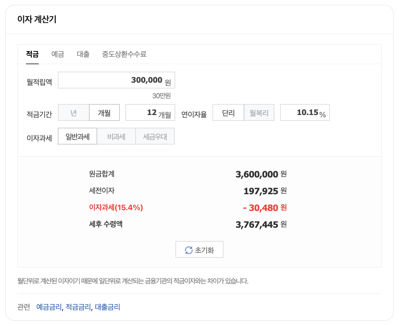 만기수령액은 적금이자계산기에서 간단하게 계산해보실 수 있는데요. 최대금리인 10.15%를 받는다고 가정하였을 경우 월 30만원씩 12개월을 불입한다고 하였을 때, 세전이자는 197,925원을 수령하게 됩니다. 이자과세를 제외하면 약 167,000원을 이자로 수령할 수 있답니다.