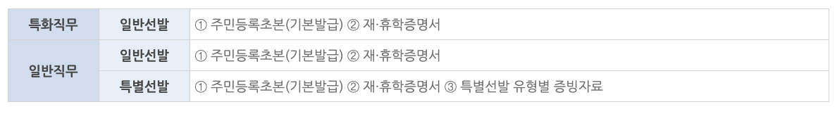- 특별선발 대상여부는 대상별 증빙서류 발급 가능 여부에 따라 판단하여 지원