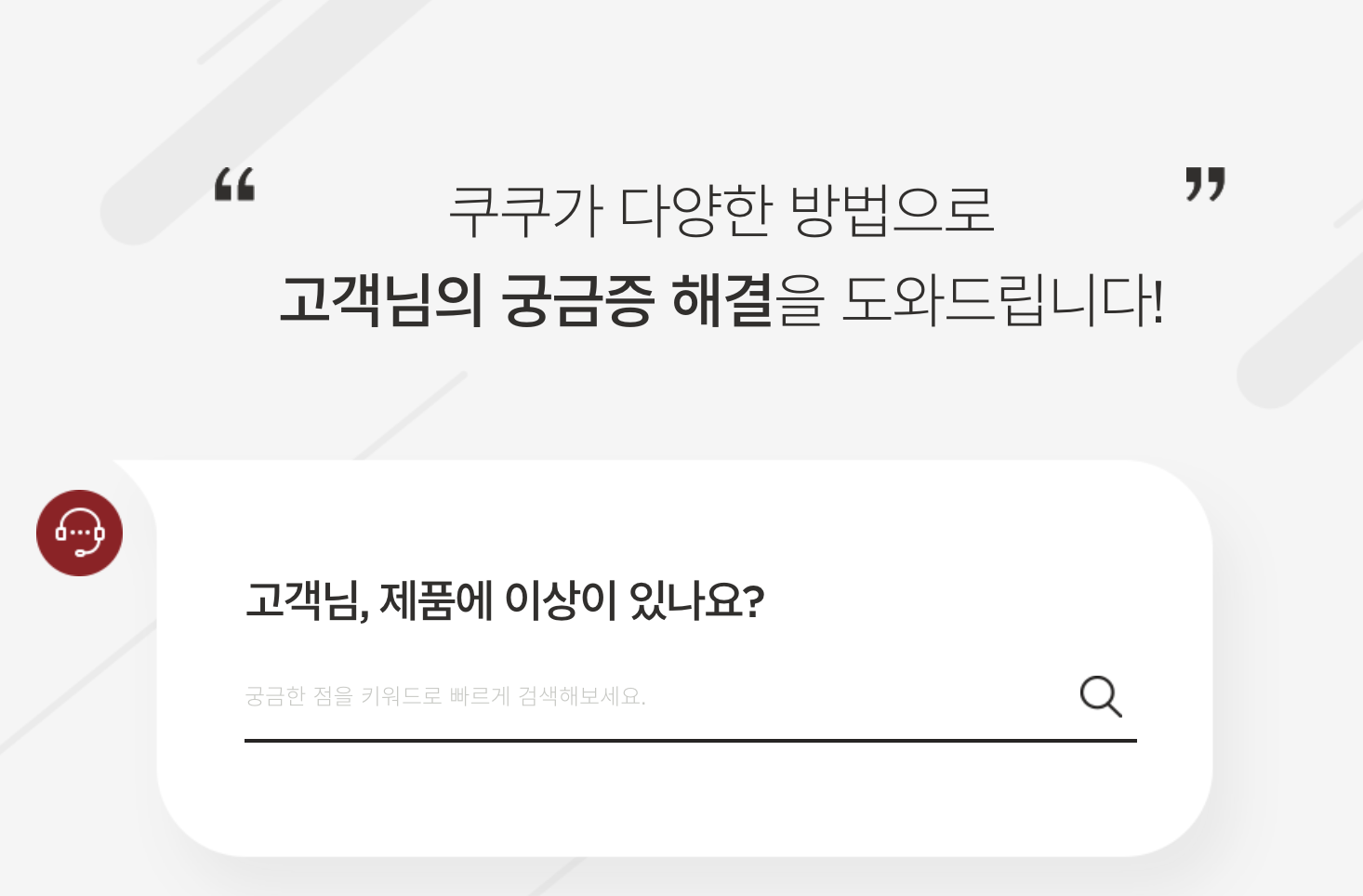 쿠쿠에서는 사용하고 계신 제품을 AS 없이 자가진단 할 수 있는 방법을 소개하고 있습니다. 자가진단 바로가기를 누르시면 제품이상에 대한 증상을 직접 입력하고 검색하신 후, 고장 여부에 대해 자가진단을 해볼 수 있습니다.