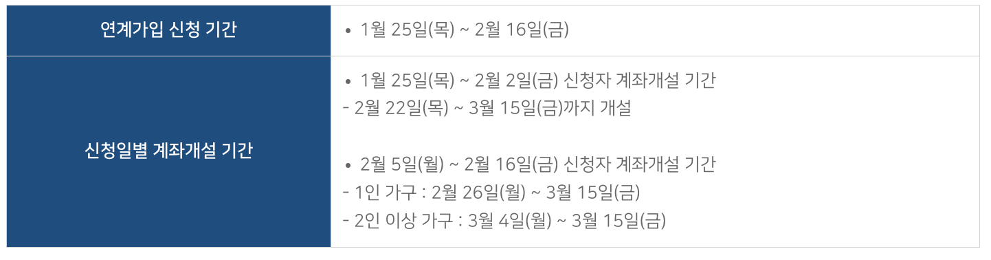 청년희망적금을 청년도약계좌로 연결하시려는 분들은 1월 25일(목) ~ 2월 16일(금)까지 연계신청을 하시면 됩니다. 계좌개설은 신청일 및 가구원수에 따라 2월 22일(목) ~ 3월 15일(금)까지 가능합니다. 청년도약계좌는 매월 가입이 가능하나, 일시납 방식으로 가입하실 경우에는 만기일이 속하는 달의 다음달까지만 신청이 가능합니다.