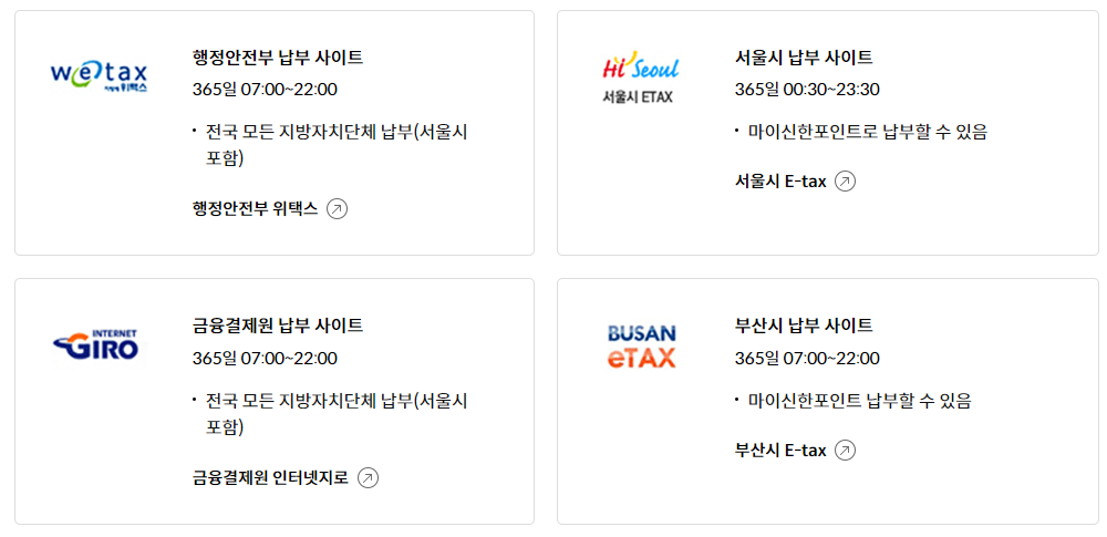 재산세 납부는 위 사이트에서 할 수 있습니다. 거주지역에 따라 해당되는 사이트에서 납부가 가능하며, 금융결제원 납부사이트 인터넷지로의 어플이나 행정안전부 위택스를 사용하시면 모바일에서도 더욱 쉽고 빠르게 납부가 가능합니다.