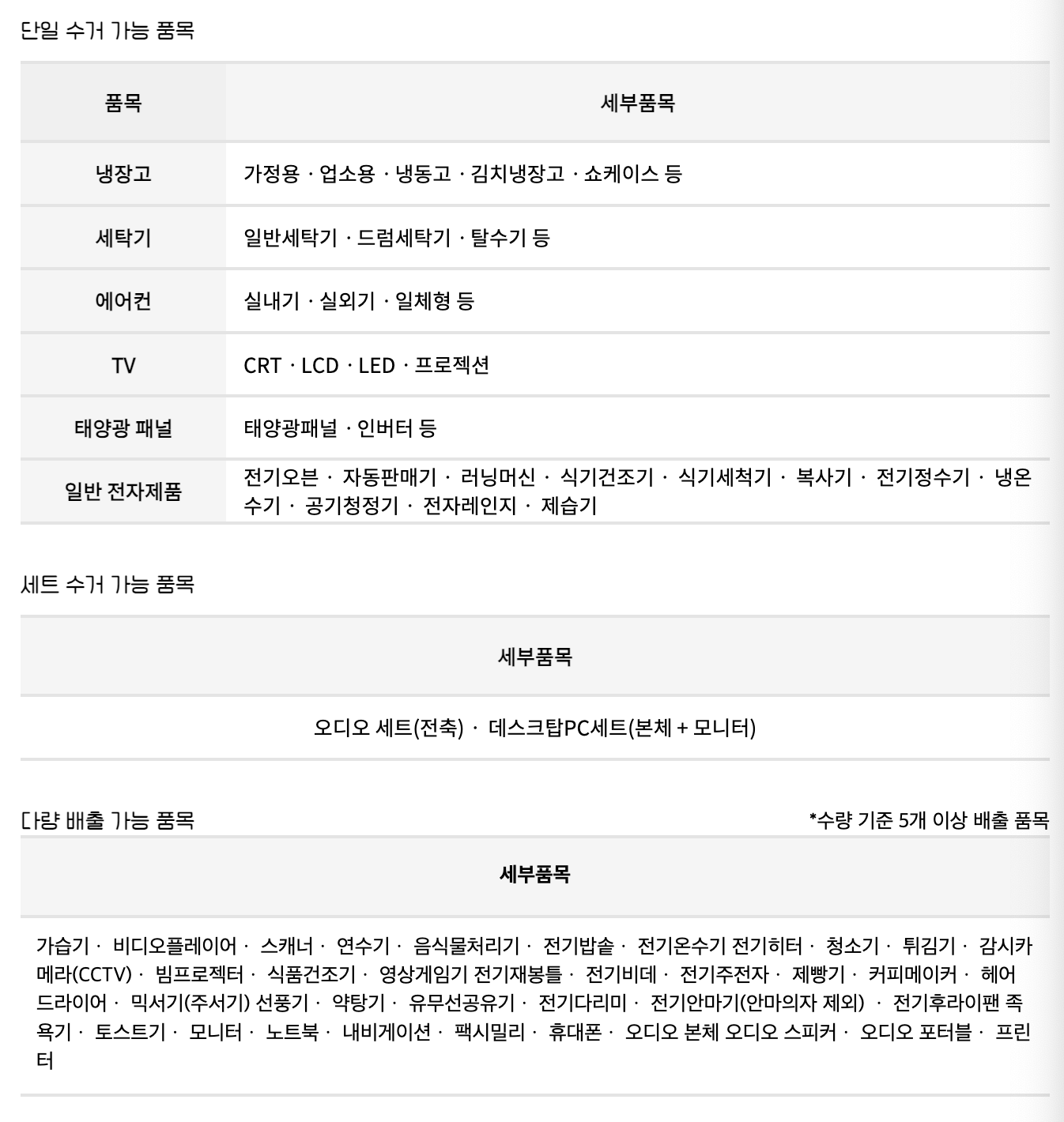 수거가 가능한 품목은 아래와 같습니다. 기본적으로 크기가 큰 냉장고, 세탁기나 에어컨과 같은 전자제품의 경우에는 1개만 배출해도 수거가 가능하므로 편리하게 이용하실 수 있습니다.