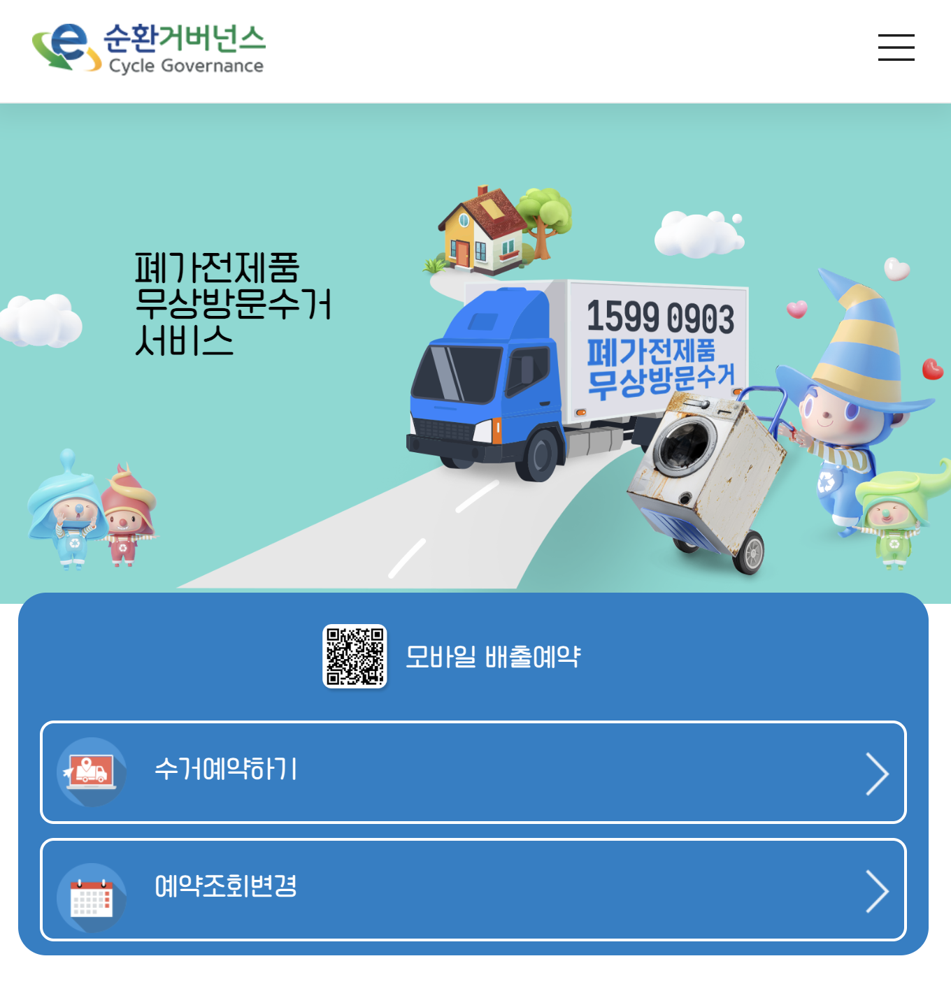 소형가전의 경우에는 재활용을 할 때 내놓거나 행정복지센터(동사무소) 지정장소에 배출하면 무료로 수거가 가능합니다. 하지만 대형가전은 크기도 클 뿐만 아니라 무게도 무거워 혼자 배출하기 쉽지 않은데요. 이런 경우에는 폐가전 방문수거 배출예약시스템을 이용하면 편리하게 대형가전을 배출할 수 있습니다.