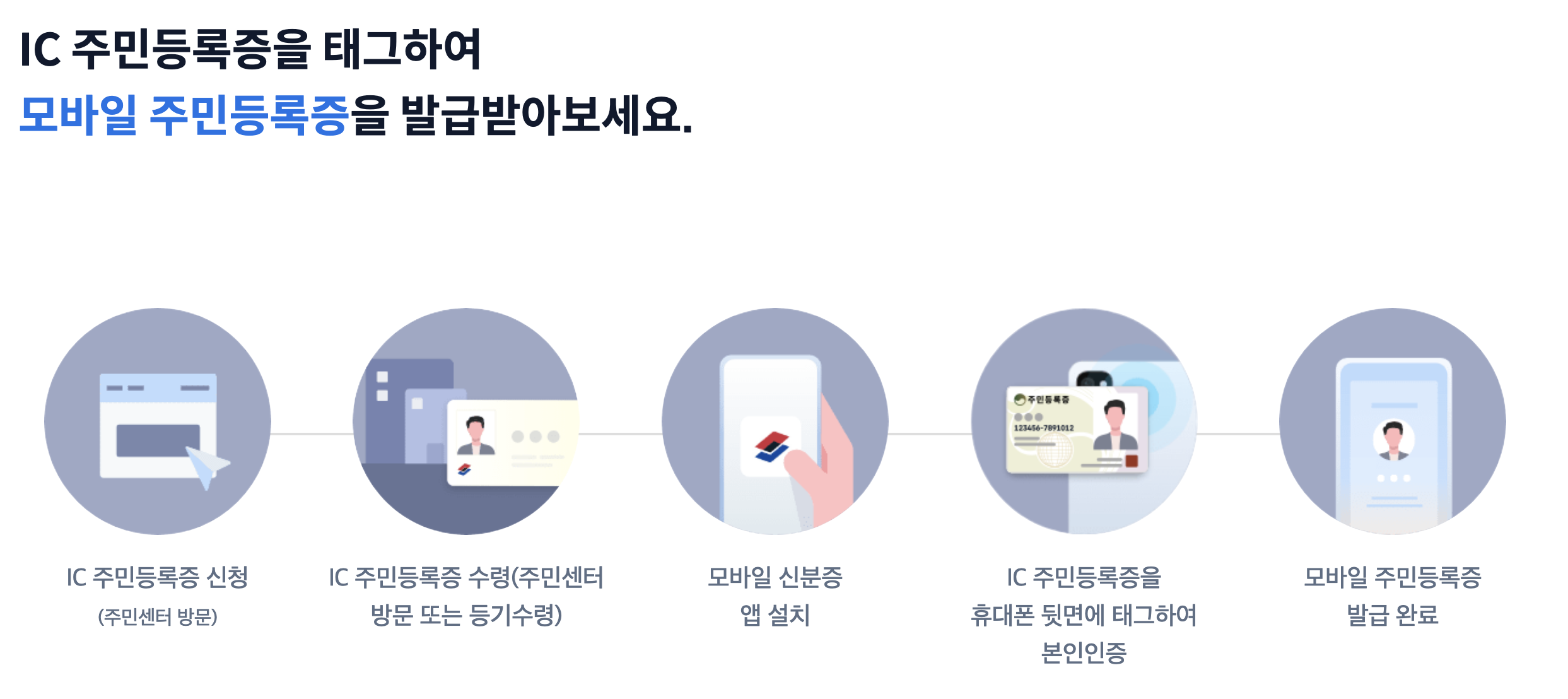 - 모바일 신분증 앱 설치 → IC 주민등록증을 휴대폰에 태그 → 즉시 발급
