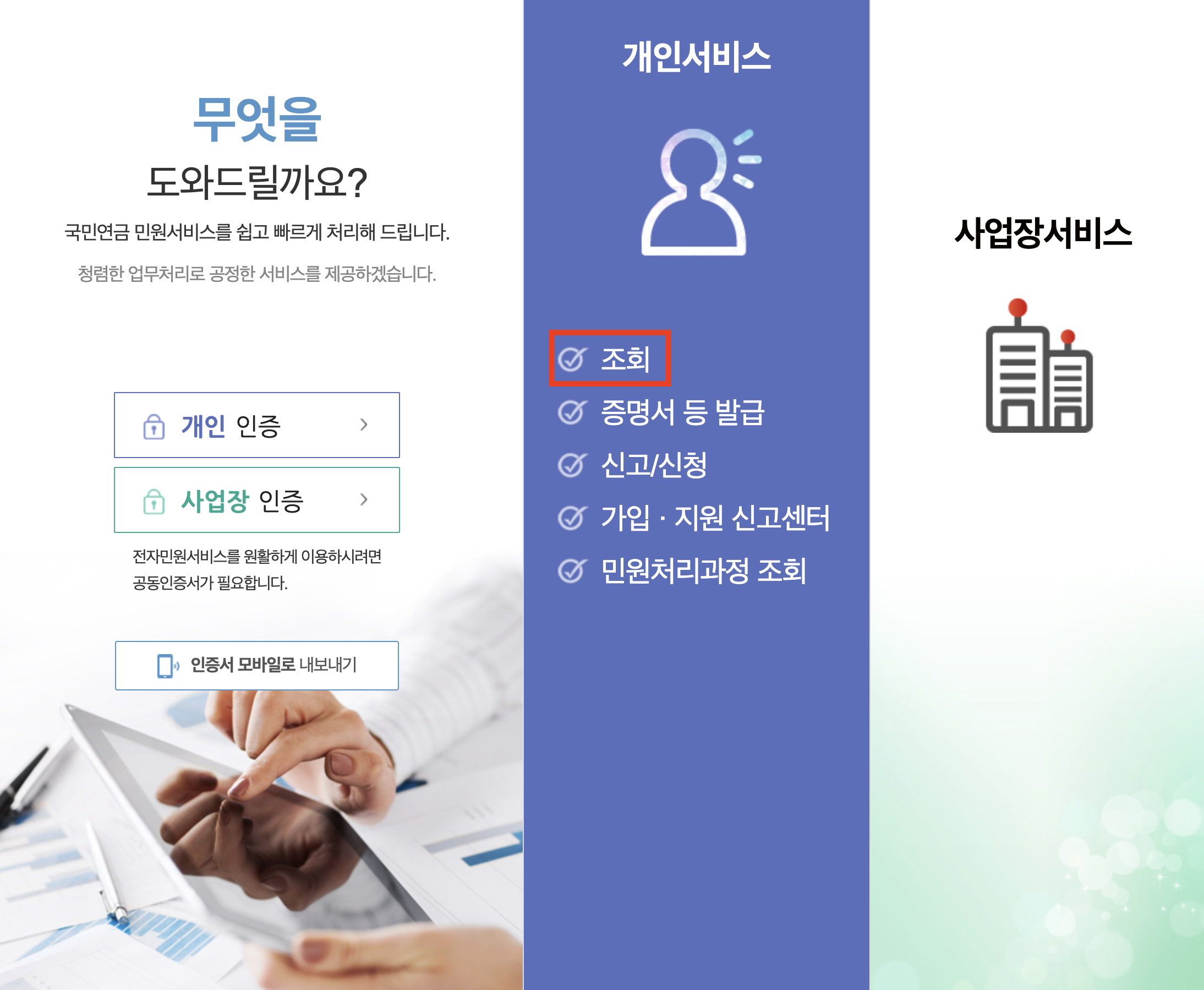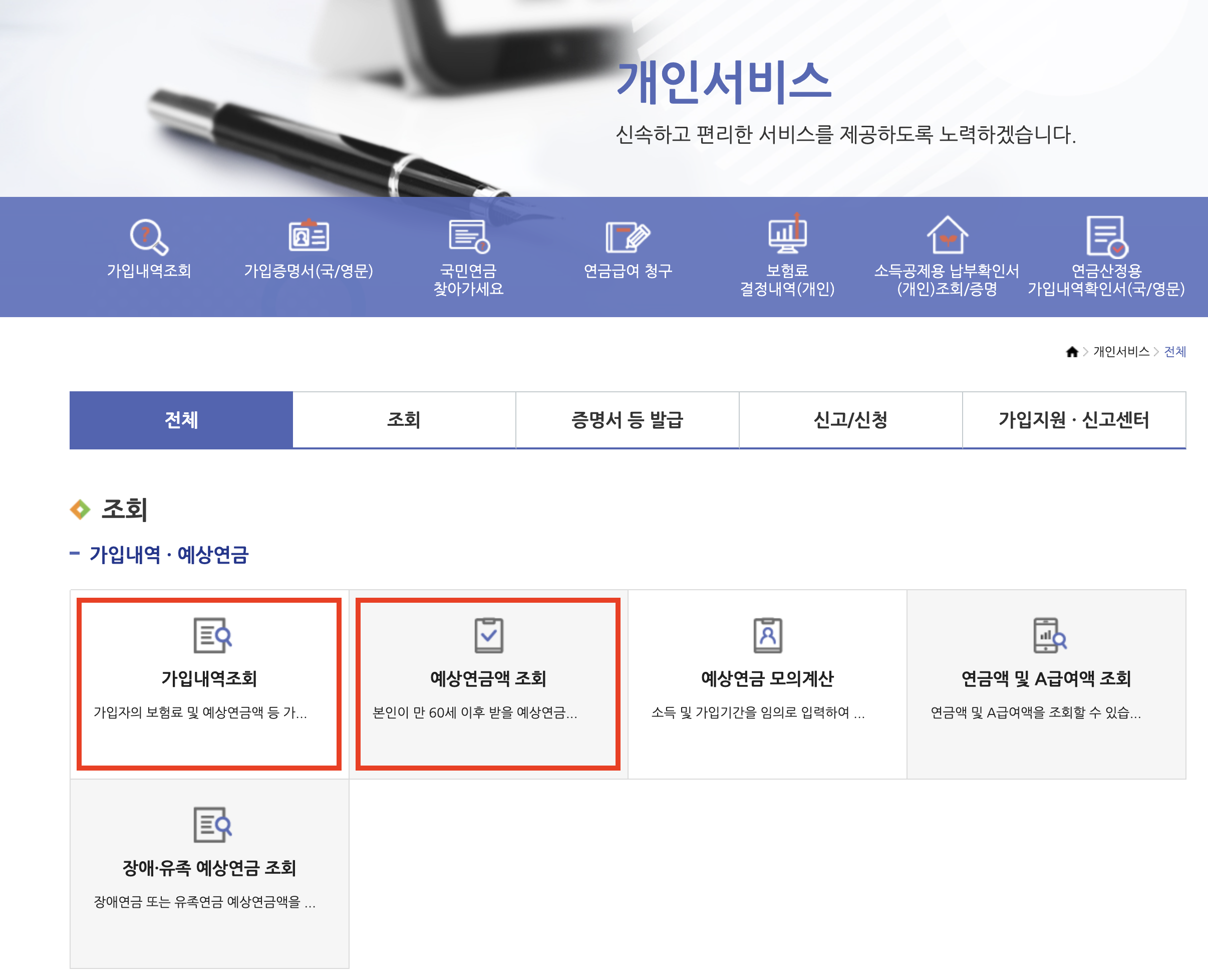 - 가입내역 조회 / 예상연금액 조회 선택