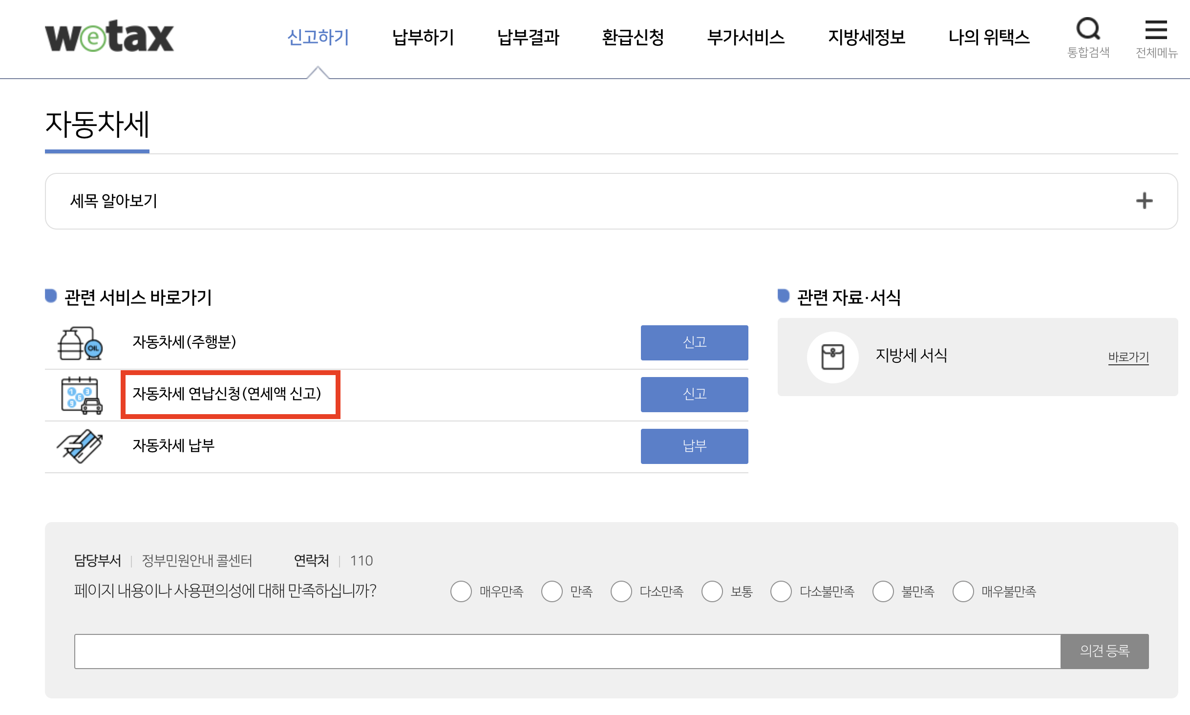 서울시와 그 외의 지역 차주에 대한 연납신청 기관이 다르기 때문에 서울시에 거주하신다면 [서울시 이택스]로 그 외의 지역에 거주하신다면 [위택스]에 접속하시면 됩니다.